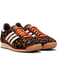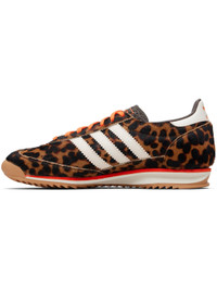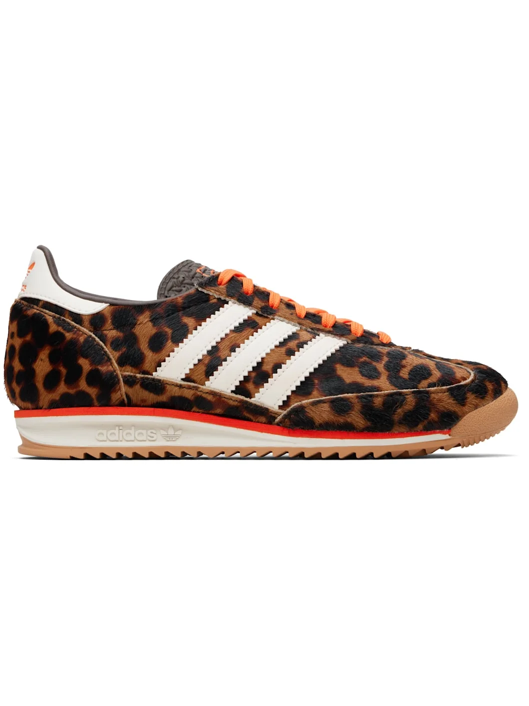 Low-top hair-on leather sneakers. · Leopard pattern throughout · Lace-up closure · Logo stamp at textured tongue · Padded collar · Signature serrated stripes at sides · Embossed logo at heel tab · Faux-leather lining · Treaded rubber sole Supplier color: Dark Brown/Off White/Semi Impact Orange Upper: leather, textile. Sole: eva, rubber. Made in Cambodia 261751F128050