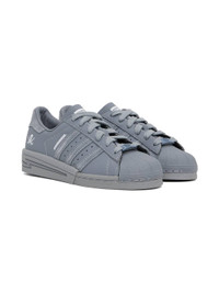 Low-top buffed leather and suede sneakers in gray. · Textured rubber cap toe · Logo plaque at lace-up closure · Logo printed at padded tongue · Padded collar · Perforated detailing and signature serrated stripes at sides · Logo and graphic embossed at outer side · Logo and text embossed at heel tab · Buffed leather lining · Treaded rubber sole Part of the adidas Originals x Neighborhood collaboration. Supplier color: Grey