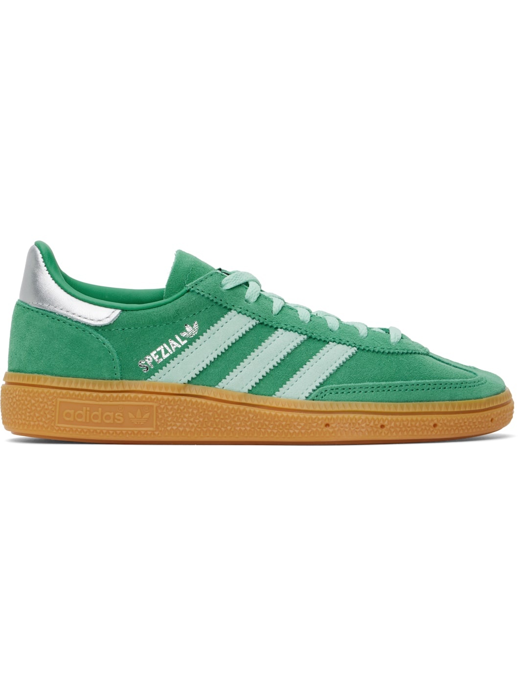 Low-top suede sneakers in green. · Lace-up closure · Logo patch at padded tongue · Padded collar · Signature serrated stripes at sides · Text and logo stamp at outer side · Buffed leather heel tab in silver tone · Buffed faux-leather and mesh lining · Logo embossed at textured rubber midsole · Treaded rubber sole Supplier color: Semi court green/Clear mint/Gum Upper: leather, synthetic. Sole: rubber. Made in Viet Nam 251751F128123