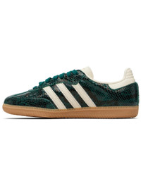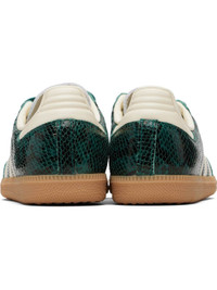 Low-top snake-embossed leather sneakers. · Lace-up closure · Logo stamp at tongue · Padded collar · Signature serrated stripes at sides · Text stamp at outer side · Quilting at heel tab · Faux-leather lining · Treaded rubber sole Supplier color: Cream White/Cream White/Collegiate Green Upper: leather, synthetic. Sole: rubber. Made in Viet Nam 252751F128078