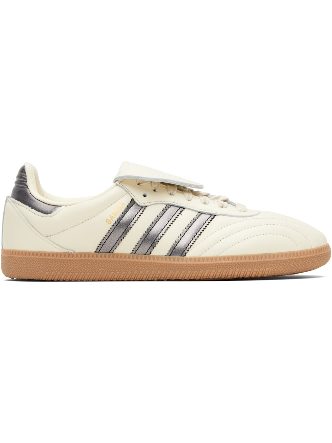 Low-top buffed leather sneakers. · Quilted toe and heel tab · Lace-up closure · Logo-embossed at extended foldover tongue · Padded collar · Text stamp at outer side · Signature serrated stripes at sides · Mesh lining · Treaded rubber sole Supplier color: Cream white/Core black/Gum Upper: leather. Sole: rubber. Made in Viet Nam 252751M237099