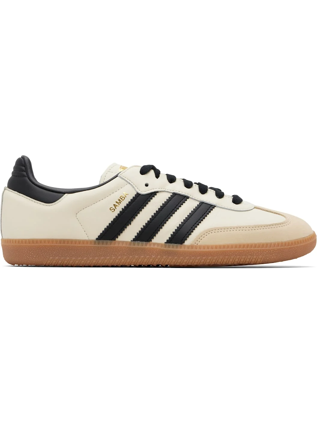 Low-top suede sneakers. · Lace-up closure · Logo printed at tongue · Serrated leather stripes at sides · Text printed at side · Leather heel tab · Treaded rubber sole Supplier color: Cream White/Black/Sand Strata Upper: leather. Sole: rubber. Made in Viet Nam 261751F128202