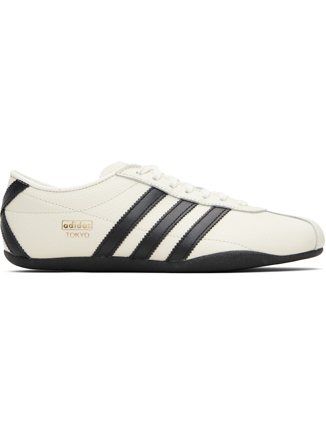 Low-top grained leather sneakers. · Lace-up closure · Logo stamp at tongue and outer side · Padded collar · Signature serrated stripes at sides and heel · Mesh lining · Crepe-rubber sole Supplier color: Off white/Core black/Gold metallic Upper: leather. Sole: rubber. Made in Viet Nam 252751M237045