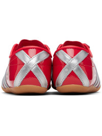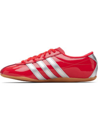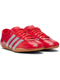Low-top patent leather sneakers. · Lace-up closure · Padded tongue and collar · Logo embossed at tongue · Logo stamp at outer side · Signature serrated stripes at sides and heel · Buffed faux-leather lining · Crepe rubber sole Supplier color: Red/Silver metallic/Gum Upper: leather. Sole: rubber. Made in Viet Nam 261751F128023