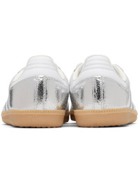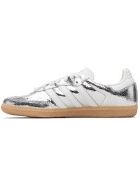 Low-top crinkled leather sneakers. · Lace-up closure · Logo stamp at tongue · Padded collar · Signature serrated stripes at sides · Text stamp at outer side · Quilting at heel tab · Faux-leather lining · Treaded rubber sole Supplier color: Silver Metallic/Cloud White/Core White Upper: leather, synthetic. Sole: rubber. Made in India 261751F128052