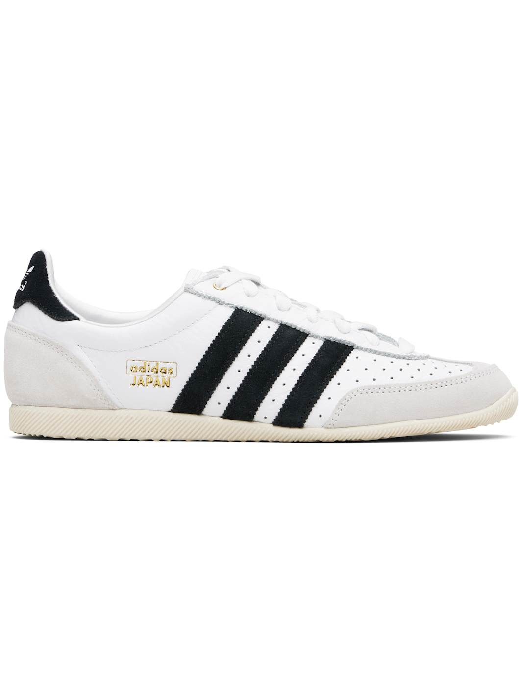 Low-top grained leather and suede sneakers. · Perforations throughout · Lace-up closure · Logo patch at tongue · Padded collar · Signature serrated stripes at sides · Logo stamp at outer side · Logo embossed at heel tab · Satin lining · Treaded rubber sole Supplier color: Cloud white/Core black/Gold metallic Upper: leather. Sole: rubber. Made in Viet Nam 252751M237131