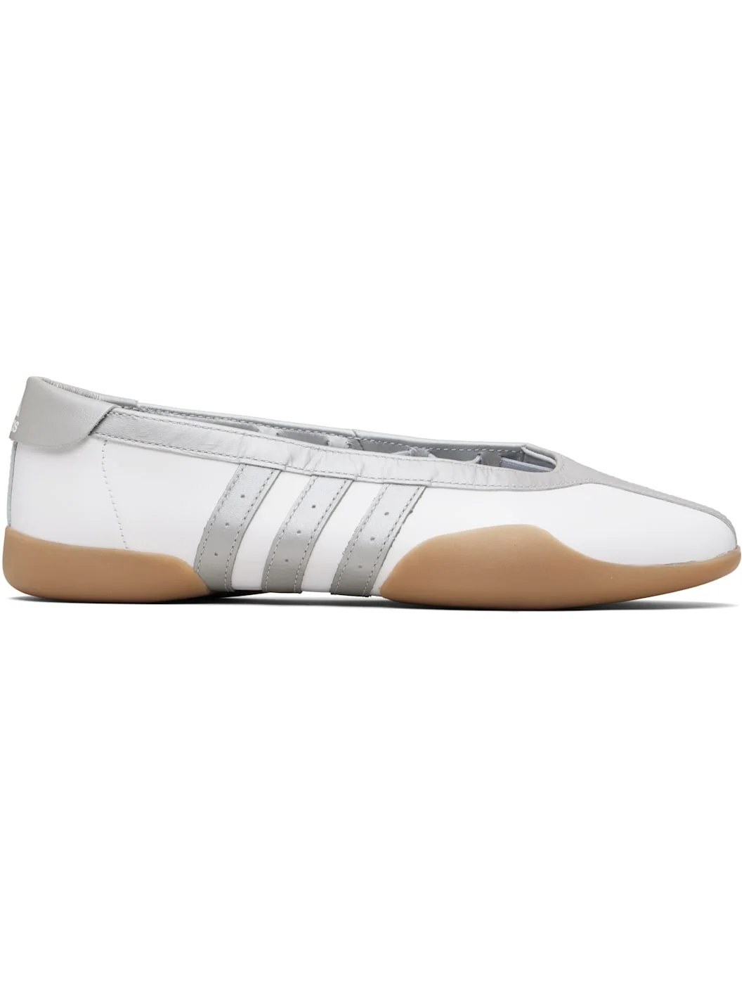 Low-top buffed leather ballerina flats. · Lace-up closure at vamp · Padded heel collar · Stripes with perforations at sides · Logo printed at heel tab · Grained leather and jersey lining · Treaded rubber sole Supplier color: Cloud White/Silver Metallic/Gum Upper: leather. Sole: rubber. Made in Indonesia 261751F128182
