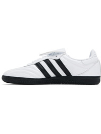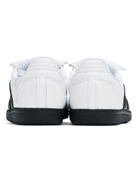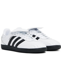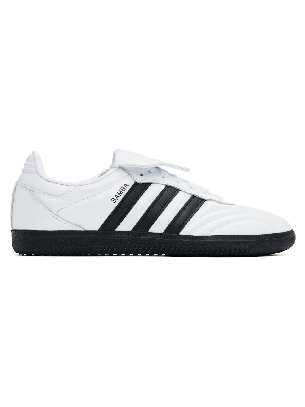 Low-top quilted patent leather sneakers in white. · Lace-up closure · Logo embossed at extended foldover tongue · Padded collar · Signature stripes at sides · Text printed at outer side · Quilted heel tab · Grained leather and mesh lining · Treaded rubber sole Supplier color: Cloud white/Core black/Cloud white Upper: leather. Sole: rubber. Made in Viet Nam 251751F128133
