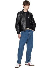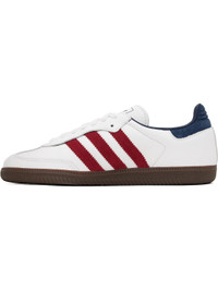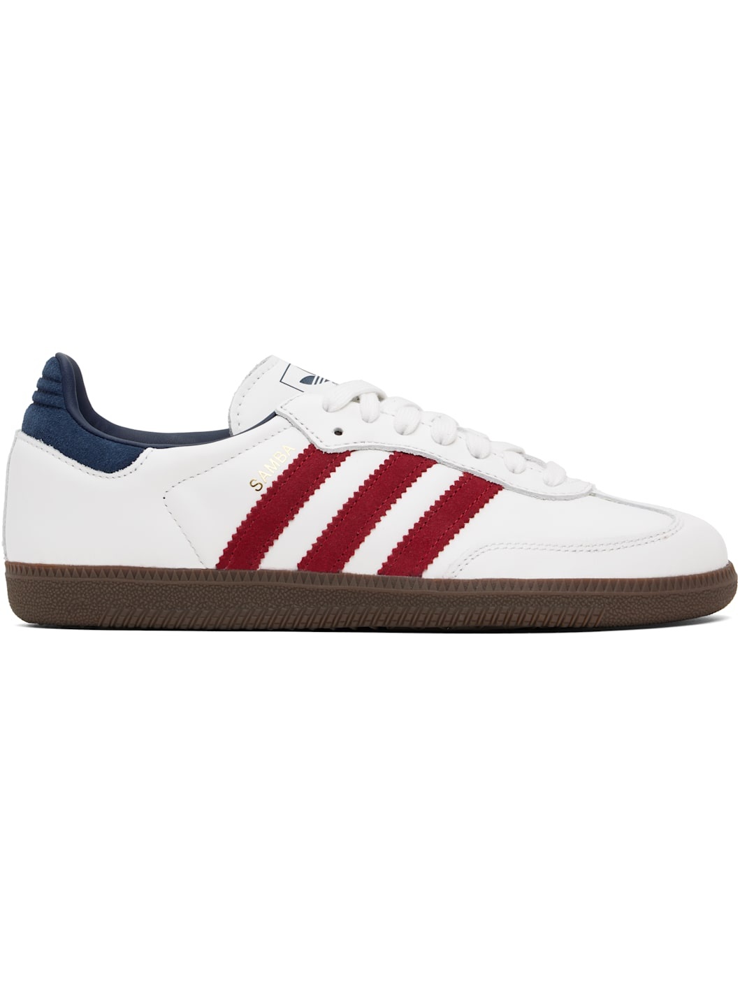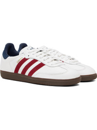 Low-top grained leather sneakers in white, red, and navy. · Suede trim throughout · Lace-up closure · Logo printed at tongue · Padded collar · Signature serrated stripes at sides · Text bonded at outer side · Buffed leather and mesh lining · Treaded rubber sole Supplier color: Core white/Team victory red/Night indigo Upper: leather. Sole: rubber. Made in Indonesia 251751M237170