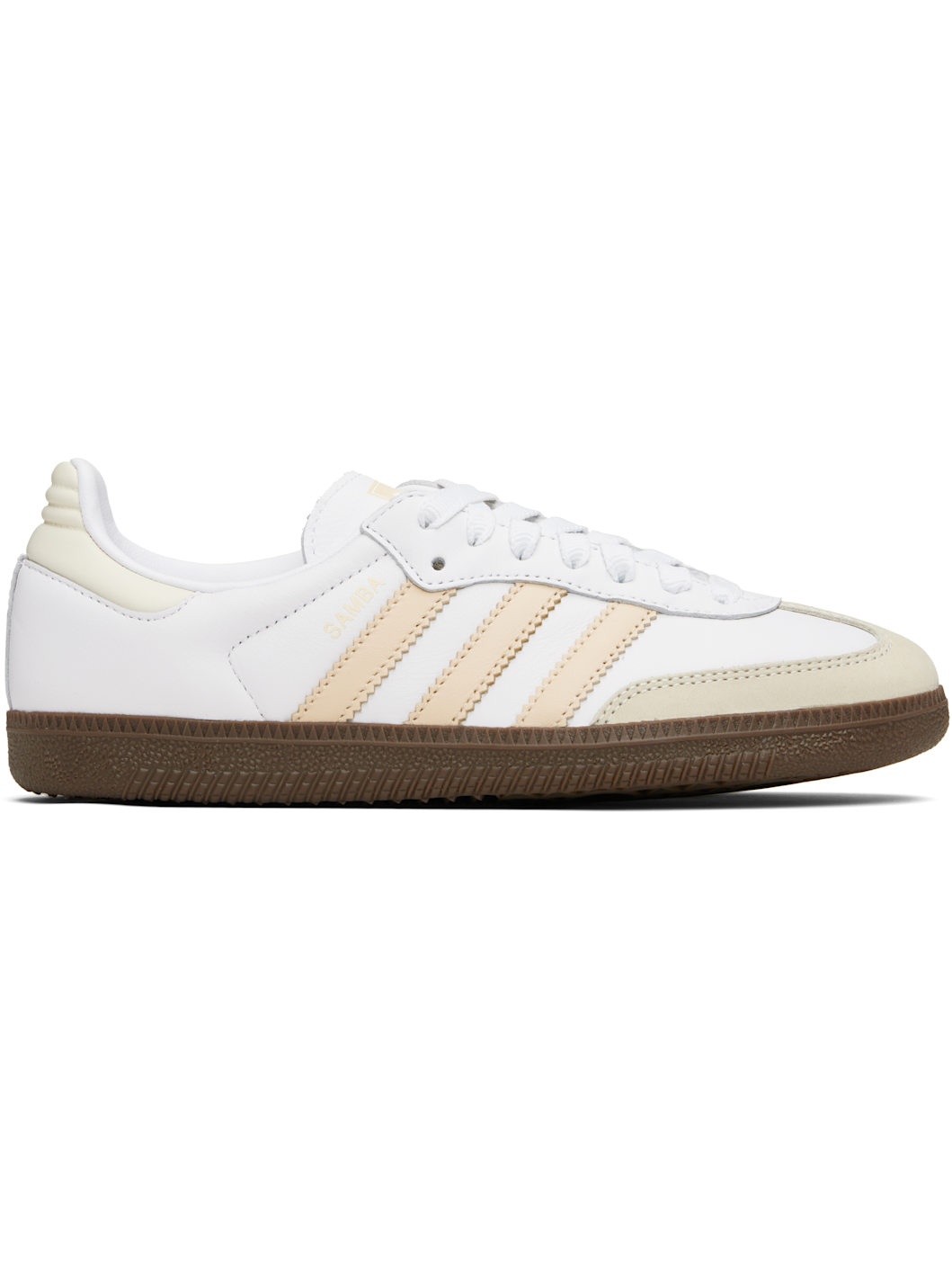 Low-top buffed leather sneakers. · Nubuck trim at toe · Lace-up closure · Logo printed at tongue · Padded collar · Signature serrated stripes at sides · Text stamped at outer side · Quilted heel tab · Mesh lining · Treaded rubber sole Supplier color: Cloud white/Sand strata/Off white Upper: leather. Sole: rubber. Made in Indonesia 252751F128023
