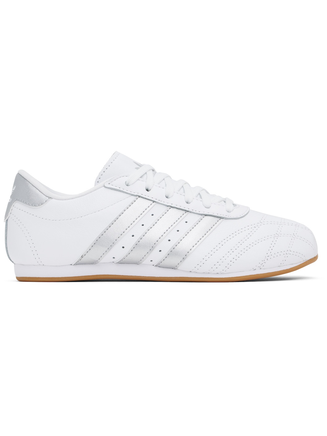Low-top grained leather sneakers in white and metallic silver tone. · Lace-up closure · Logo printed at padded tongue · Padded collar · Perforations and signature stripes at sides · Logo embossed at heel tab · Jersey lining · Treaded rubber sole Supplier color: Cloud white/Metallic silver/Gum Upper: leather. Sole: rubber. Made in Viet Nam 251751F128163