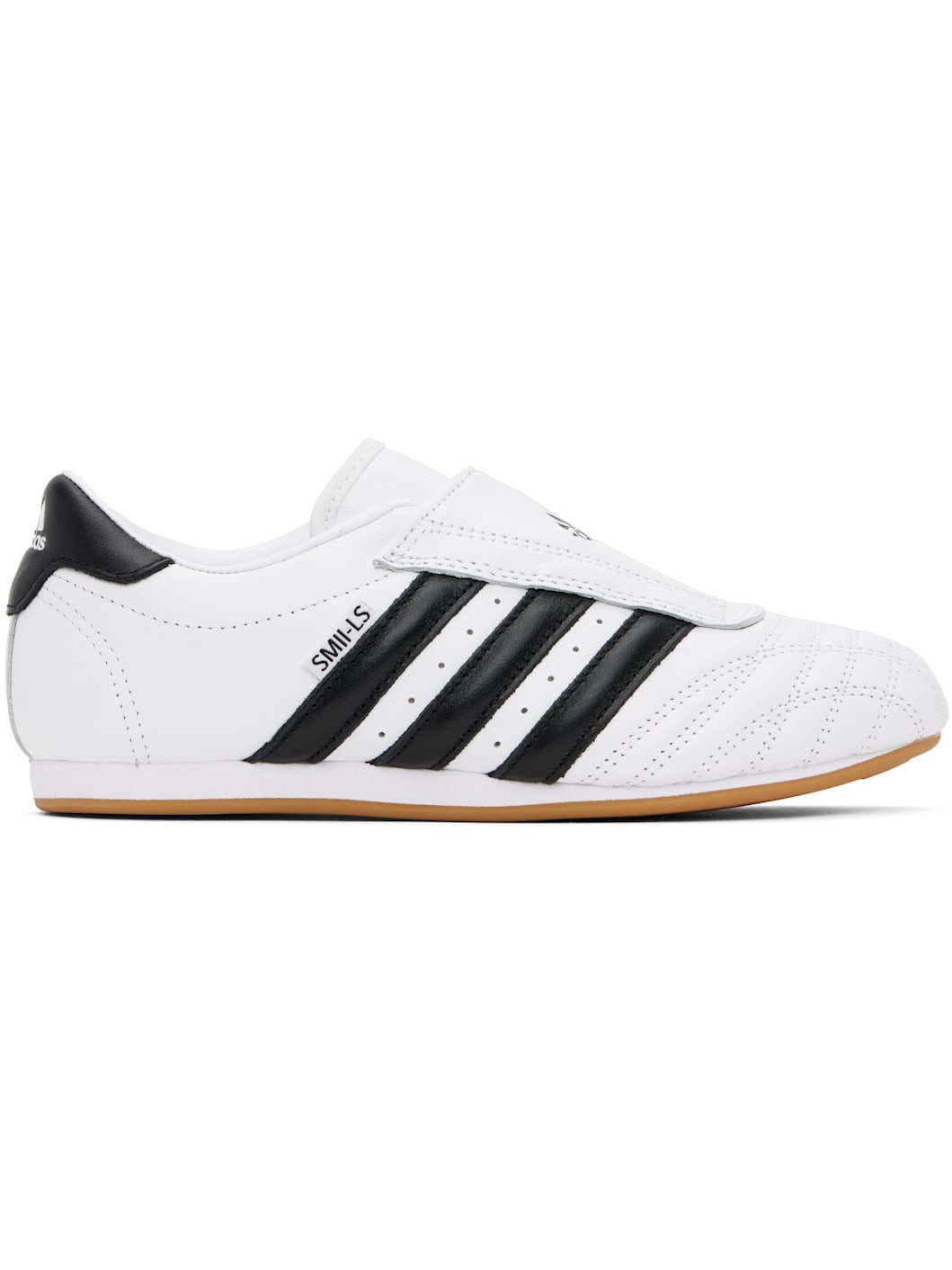 Low-top buffed leather sneakers in white. · Quilted detailing at toe · Logo embossed at vamp and heel tab · Concealed elasticized gusset · Padded tongue and collar · Signature stripes and perforations at sides · Buffed leather and mesh lining · Treaded rubber sole Supplier color: Cloud white/Core black/Gum Upper: leather. Sole: rubber. Made in Viet Nam 251751F128083