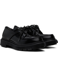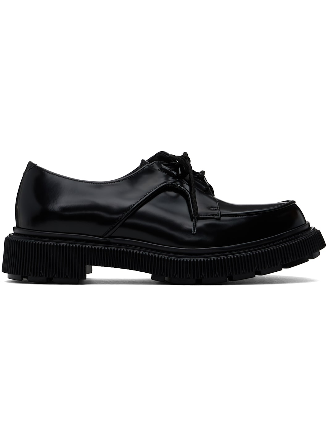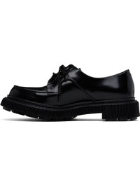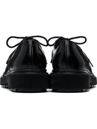 Polished leather derbys in black. · Moc toe · Lace-up closure · Logo printed at padded leather footbed · Suede and buffed leather lining · Topstitching at welt · Textured rubber midsole · Treaded rubber sole Supplier color: Black Upper: leather. Sole: rubber. Made in Portugal 251546M225017