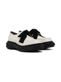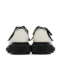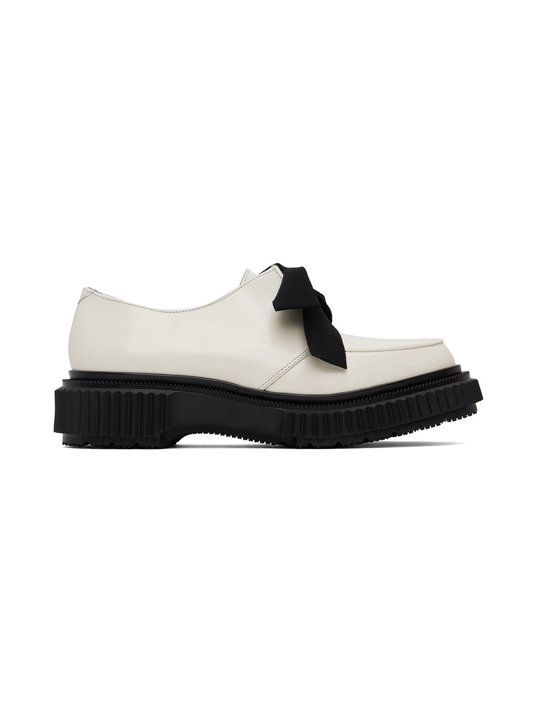 Polished leather derbys in off-white. · Moc toe · Bow accent at lace-up closure · Logo stamp at padded footbed · Buffed leather and suede lining · Serrated edge at welt and midsole · Treaded rubber sole Supplier color: Ivory