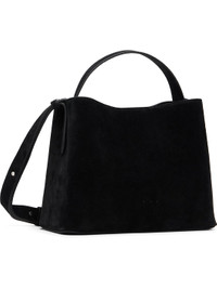 Calfskin suede shoulder bag. · Burnished edges throughout · Fixed carry handle · Adjustable shoulder strap · Logo graphic embossed at face · Magnetic fastening at open throat · Patch pocket at faux-suede interior · H7.5" x W9.5" x D4.5" Supplier color: Black Calfskin. Made in Spain 261239F048029