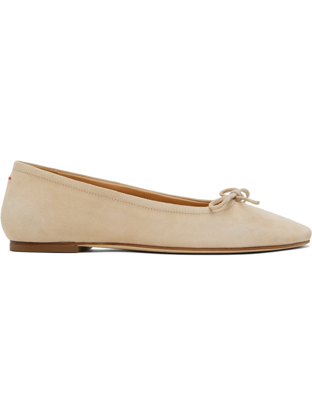Goatskin suede ballerina flats in beige. · Bow accent at vamp · Red stitch at heel collar · Logo embossed at padded lambskin footbed · Stacked leather heel with rubber injection · Nubuck sole Supplier color: Latte Upper: goatskin. Sole: leather. Made in Italy 251454F118054