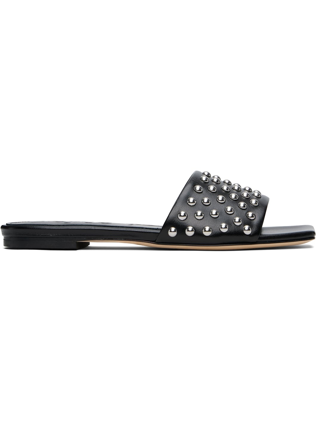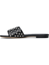 Buffed nappa leather slip-on flat sandals in black. · Open square toe · Strap with studs at vamp · Logo embossed at padded footbed · Buffed lambskin lining · Rubber heel · Leather sole Supplier color: Black nappa Upper: leather. Sole: leather, rubber. Made in Italy 252454F124002