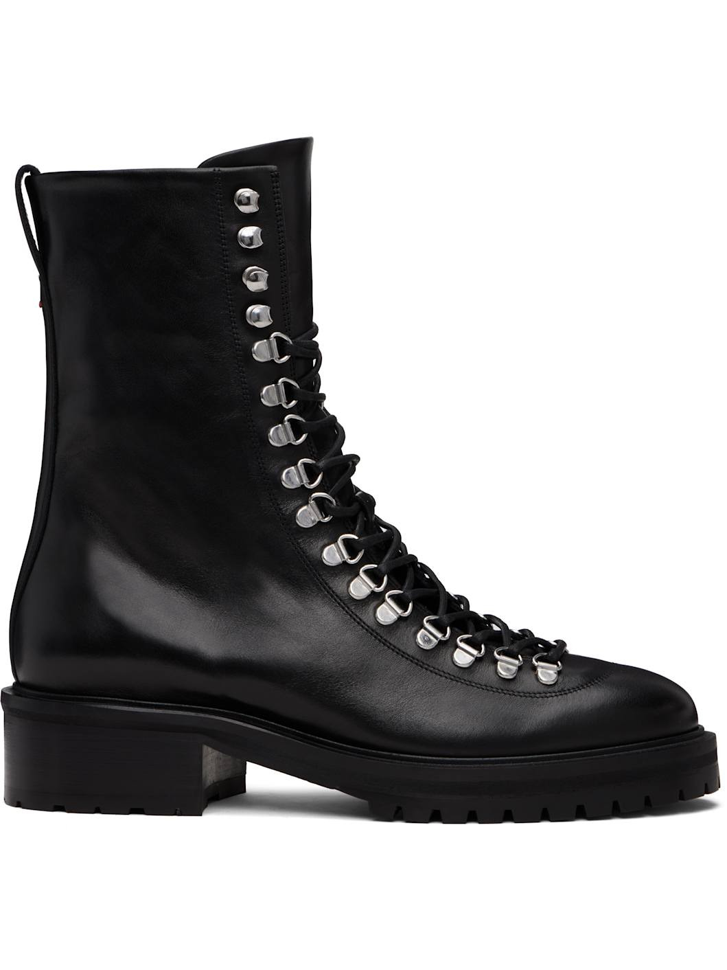 Ankle-high buffed calfskin boots. · Lace-up closure · Zip closure at inner side · Pull-loop and red stitch at heel collar · Buffed leather lining · Stacked leather and rubber midsole and block heel · Treaded rubber sole · Silver-tone hardware · Heel: H1.5" Supplier color: Black Upper: calfskin. Sole: leather, rubber. Made in Italy 252454F113006
