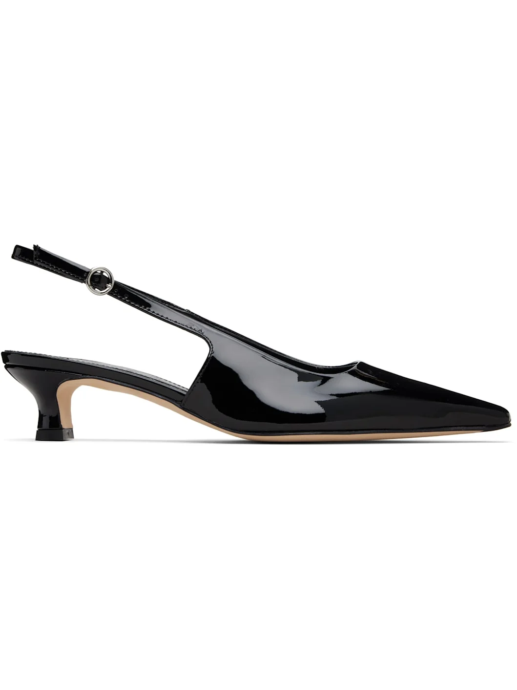 Patent calfskin heels. · Pointed toe · Pin-buckle slingback strap · Buffed lambskin lining · Kitten heel with rubber injection · Nubuck sole with rubber injection · Heel: H1.5" Supplier color: Black patent Upper: calfskin. Sole: leather, rubber. Made in Italy 261454F122004