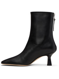 Ankle-high buffed calfskin boots. · Pointed square toe · Central seam at vamp · Zip closure and red stitch at heel · Buffed leather lining · Stacked leather heel with rubber injection · Leather sole · Heel: H2.25" Supplier color: Black Upper: calfskin. Sole: leather. Made in Italy 252454F113013