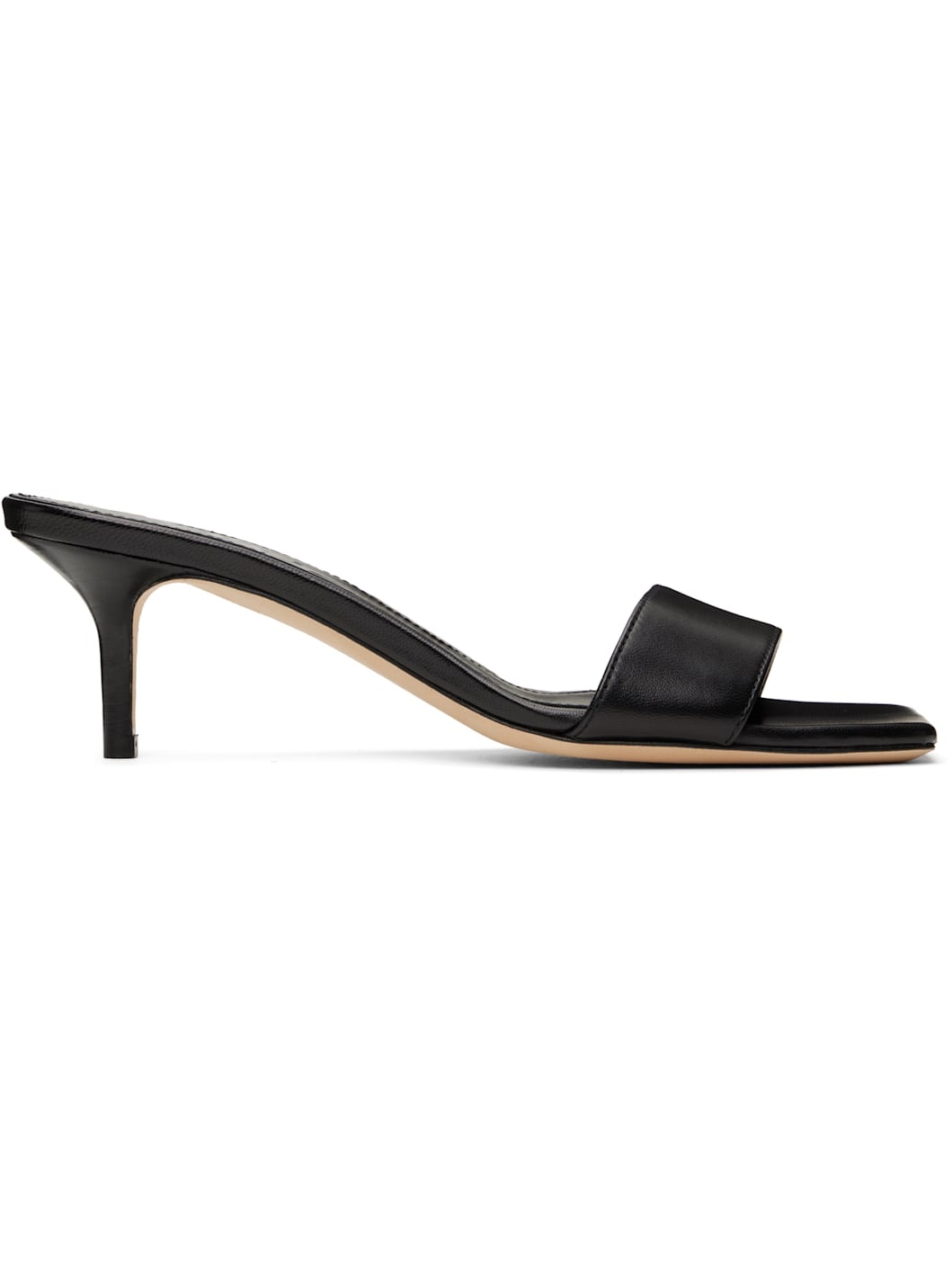 Buffed nappa leather mules in black. · Open square toe · Strap at vamp · Covered kitten heel with rubber injection · Suede sole · Heel: H2.5" Supplier color: Black nappa Upper: leather, lambskin. Sole: leather, rubber. Made in Italy 251454F125024
