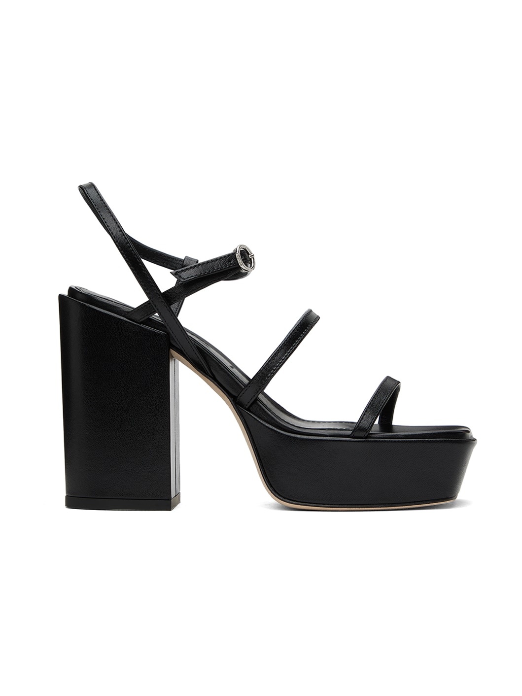 Grained nappa leather heeled sandals in black. · Open square toe · Straps at vamp · Pin-buckle ankle strap · Logo embossed at padded lambskin footbed · Covered platform midsole and block heel · Suede sole · Platform: H1.5" · Heel: H4.25" Supplier color: Black Leather. Made in Italy 241454F125011