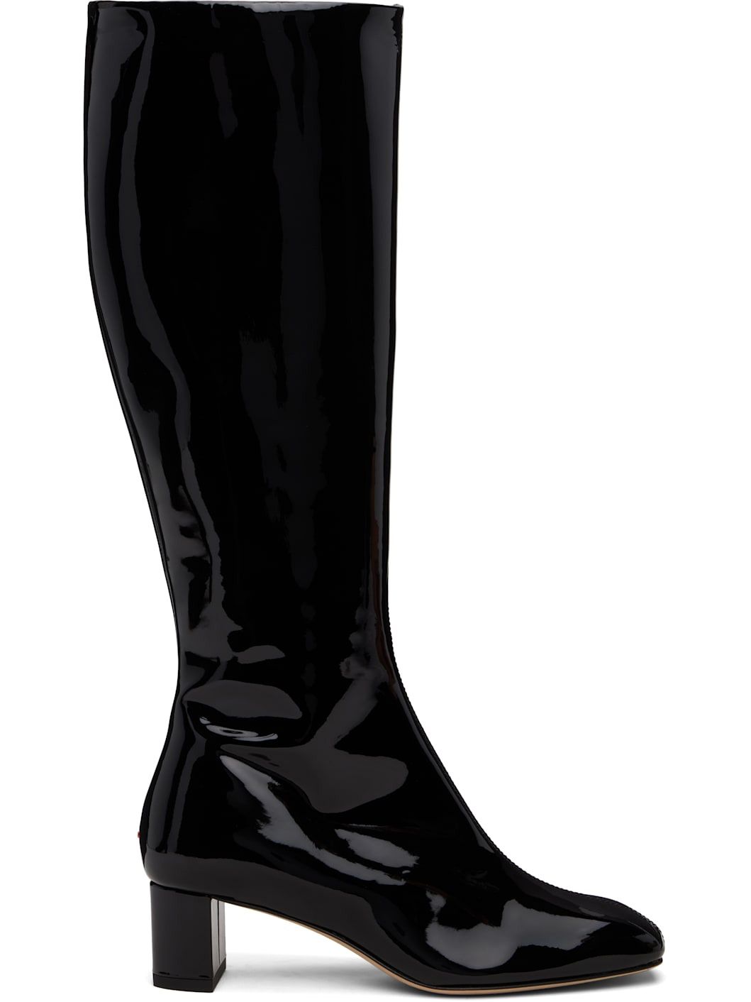 Knee-high patent calfskin boots. · Square toe · Central seam at vamp · Zip closure at inner side · Red stitch at heel · Buffed leather lining · Block heel with rubber injection · Leather sole · Heel: H1.75" Supplier color: Black Upper: calfskin. Sole: leather. Made in Italy 252454F115005