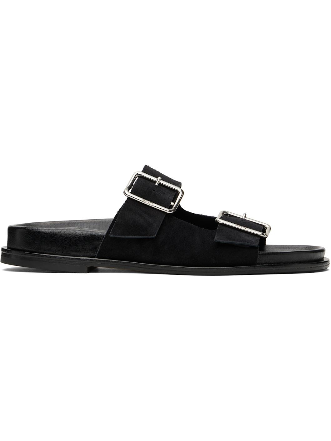 Suede sandals in black. · Open square toe · Pin-buckle straps at vamp · Suede sole with rubber injections · Logo-engraved silver-tone hardware Supplier color: Black suede Upper: leather, lambskin. Sole: leather, rubber. Made in Italy 251454F124013