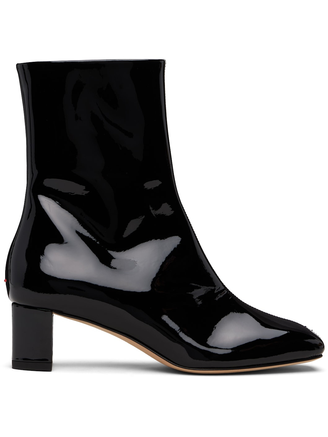 Ankle-high patent calfskin boots. · Square toe · Central seam at vamp · Zip closure at inner side · Red stitch at heel · Buffed leather lining · Covered block heel with rubber injection · Leather sole · Heel: H1.75" Supplier color: Black Upper: calfskin. Sole: leather. Made in Italy 252454F113008