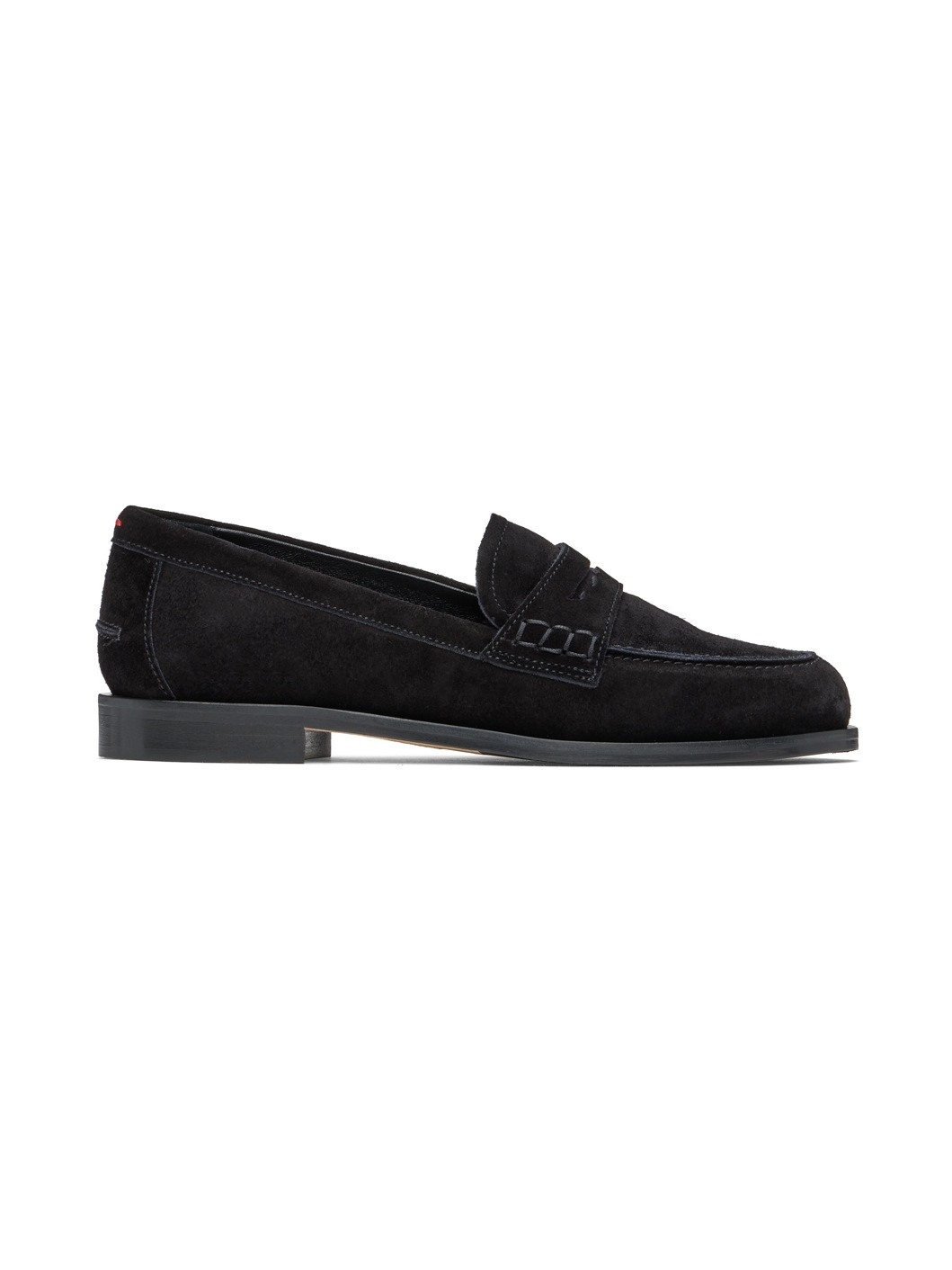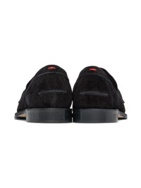 Handcrafted LWG-certified suede loafers in black. · Moc toe · Strap with cutout at vamp · Red stitch at heel · Pinched seam at heel counter · Logo embossed at padded lambskin footbed · Suede and grained lambskin lining · Stacked leather heel with rubber injection · Nubuck sole · Heel: H1" Supplier color: Black suede Upper: leather. Sole: leather, rubber. Made in Italy 242454F121002
