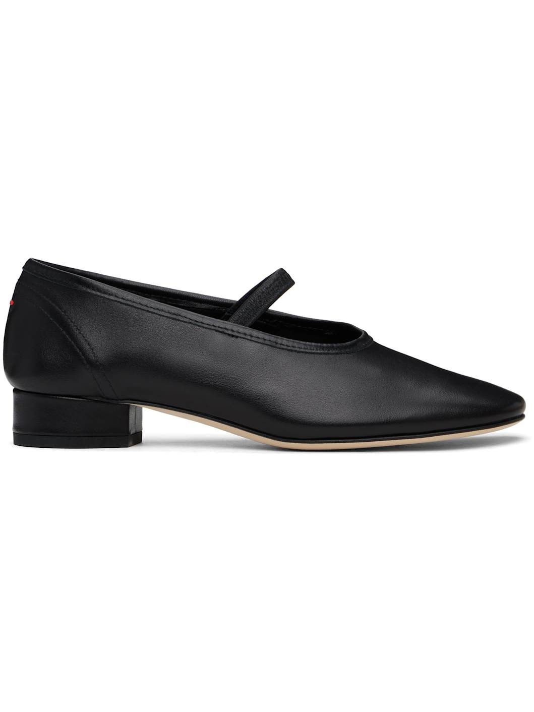 Buffed nappa leather ballerina flats in black. · Square toe · Elasticized strap at vamp · Red stitch at heel collar · Grained leather lining · Covered block heel with rubber injection · Suede sole · Heel: H1" Supplier color: Black Upper: leather. Sole: leather, rubber. Made in Italy 251454F118065