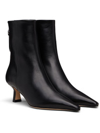 Ankle-high buffed calfskin boots. · Pointed toe · Zip closure and red stitch at heel · Buffed leather lining · Covered kitten heel · Leather sole with rubber injections · Heel: H2" Supplier color: Black Upper: calfskin. Sole: leather, rubber. Made in Italy 252454F113015