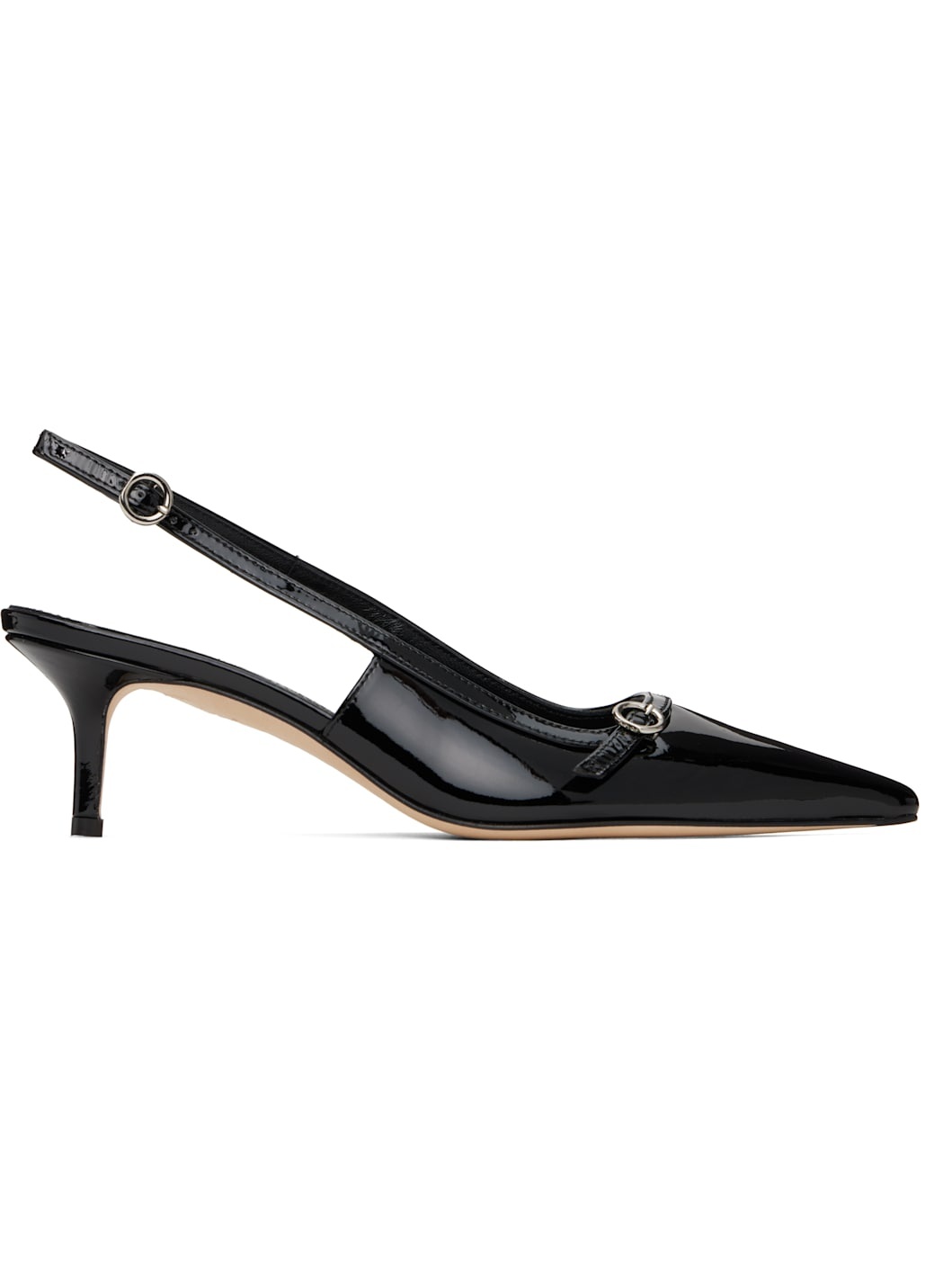 Handcrafted and LWG-certified patent calfskin heels in black. · Pointed toe · Pin-buckle tab at vamp · Pin-buckle slingback strap · Logo embossed at padded lambskin footbed · Grained lambskin lining · Stacked leather heel with rubber injection · Nubuck sole with rubber injection · Heel: H2" Supplier color: Black patent Upper: calfskin. Sole: leather, rubber. Made in Italy 251454F122006