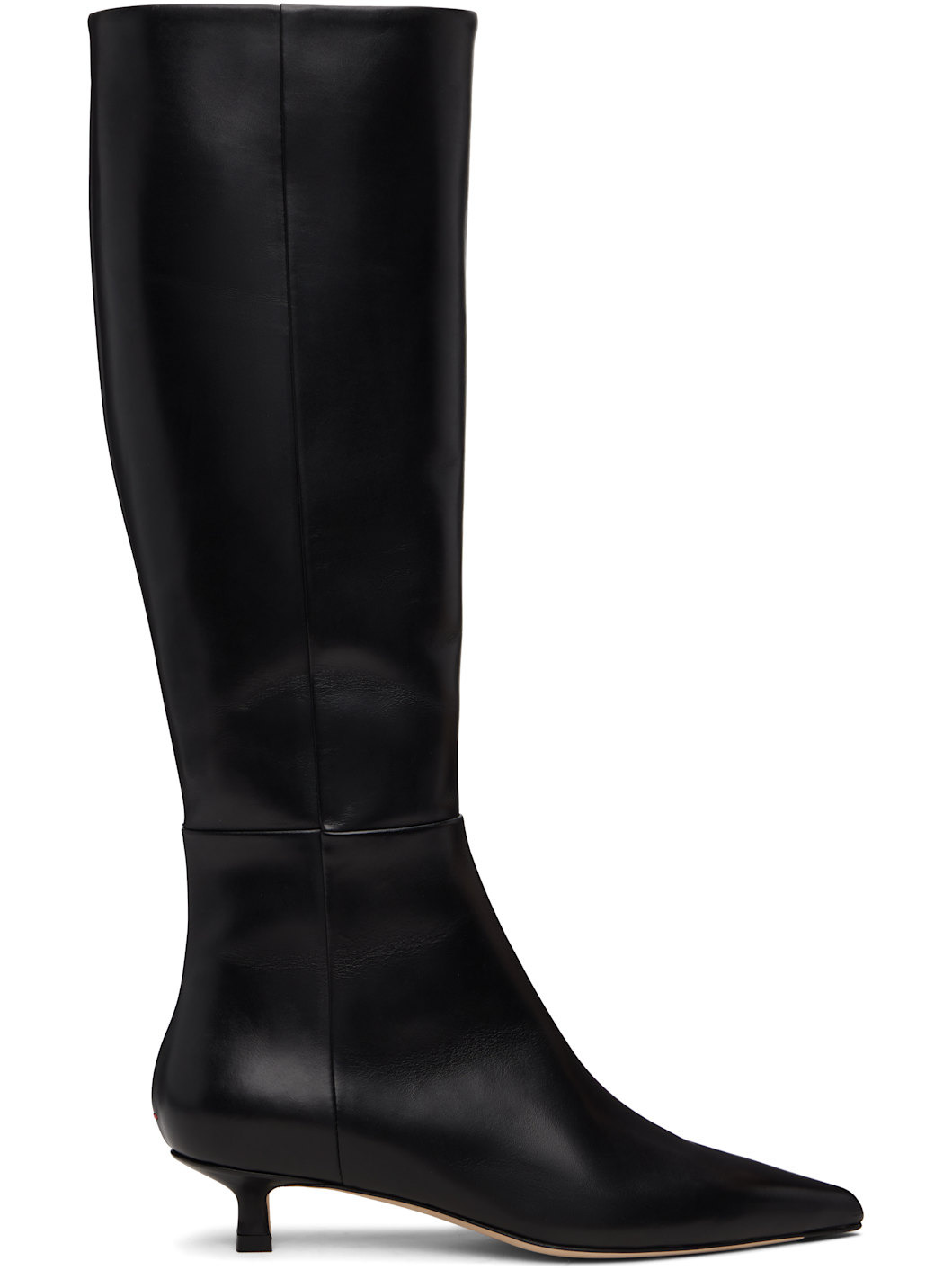 Knee-high polished calfskin boots. · Paneled construction · Pointed toe · Zip closure at inner side · Red stitch at heel · Buffed leather lining · Kitten heel · Leather sole with rubber injections · Heel: H1.25" Supplier color: Black Upper: calfskin. Sole: leather. Made in Italy 252454F115008