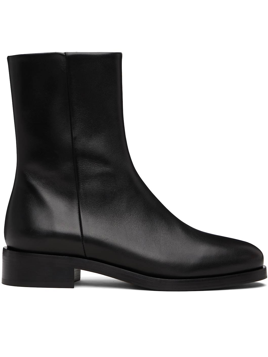 Ankle-high buffed calfskin boots. · Zip closure at inner side · Red stitch at heel · Buffed leather lining · Stacked leather block heel · Leather sole with rubber injections · Heel: H1.25" Supplier color: Black Upper: calfskin. Sole: rubber, leather. Made in Italy 252454F113033