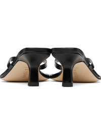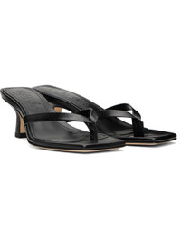 Buffed nappa leather heeled sandals in black. · Open square toe · Thong-style strap at vamp · Covered kitten heel with rubber injection · Suede sole · Heel: H2" Supplier color: Black nappa Upper: leather, goatskin. Sole: leather, rubber. Made in Italy 251454F125003