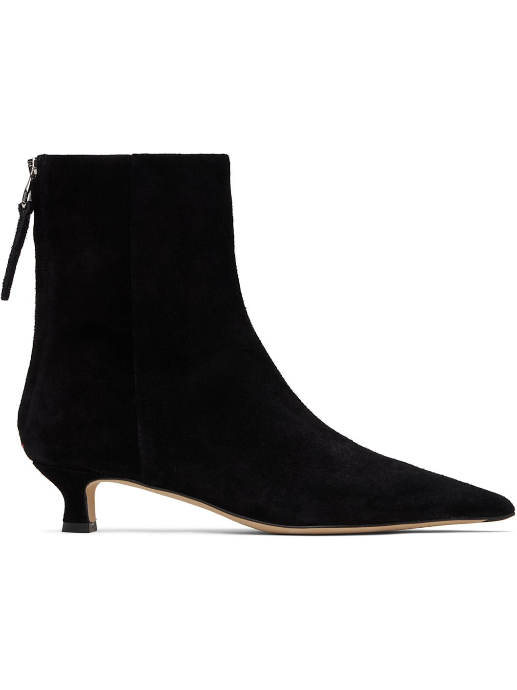 Ankle-high suede boots. · Pointed toe · Zip closure at back · Red stitch at heel counter · Lambskin lining · Covered kitten heel · Nubuck sole with rubber injections · Heel: H1.5" Supplier color: Black Upper: leather. Sole: leather, rubber. Made in Italy 252454F113027