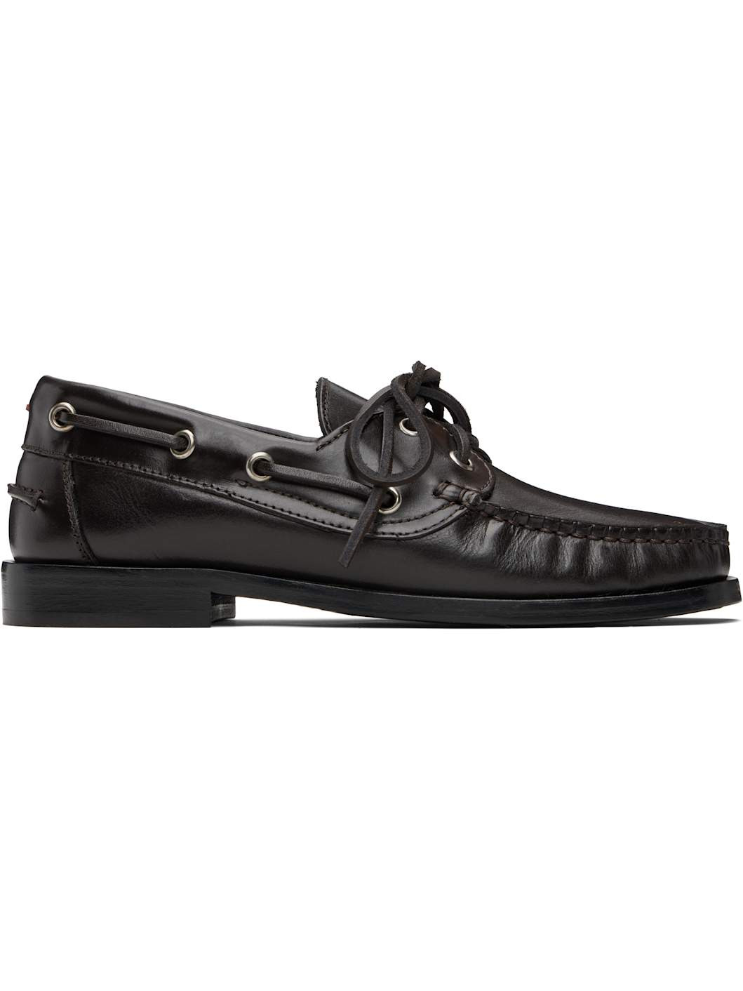 Buffed calfskin boat shoes. · Moc toe · Lace-up closure · Red stitch at heel tab · Pinched seam at heel counter · Stacked leather midsole and block heel · Leather sole with rubber injections Supplier color: Moka calf Upper: calfskin. Sole: leather, rubber. Made in Italy 252454F121011