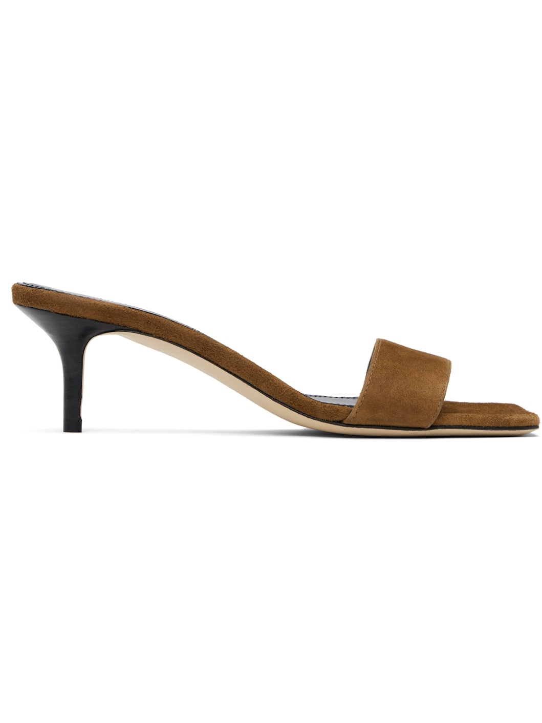 Kidskin suede mules in brown. · Open square toe · Strap at vamp · Logo embossed at padded leather footbed · Grained leather lining · Stacked leather heel with rubber injection · Nubuck sole · Heel: H2" Supplier color: Brown Upper: kidskin. Sole: leather. Made in Italy 251454F125038