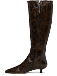 Knee-high snake-embossed calfskin boots. · Paneled construction · Pointed toe · Zip closure at inner side · Red stitch at heel · Buffed leather lining · Kitten heel · Leather sole with rubber injections · Heel: H1.25" Supplier color: Moka Upper: calfskin. Sole: leather. Made in Italy 252454F115007