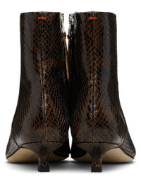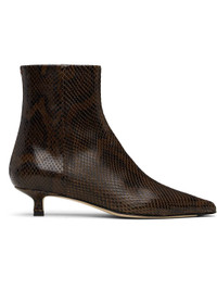 Ankle-high snake-embossed calfskin boots. · Pointed toe · Zip closure at inner side · Red stitch at heel collar · Buffed lambskin lining · Covered kitten heel · Leather sole with rubber injections · Heel: H1" Supplier color: Moka Upper: calfskin. Sole: leather. Made in Italy 252454F113019