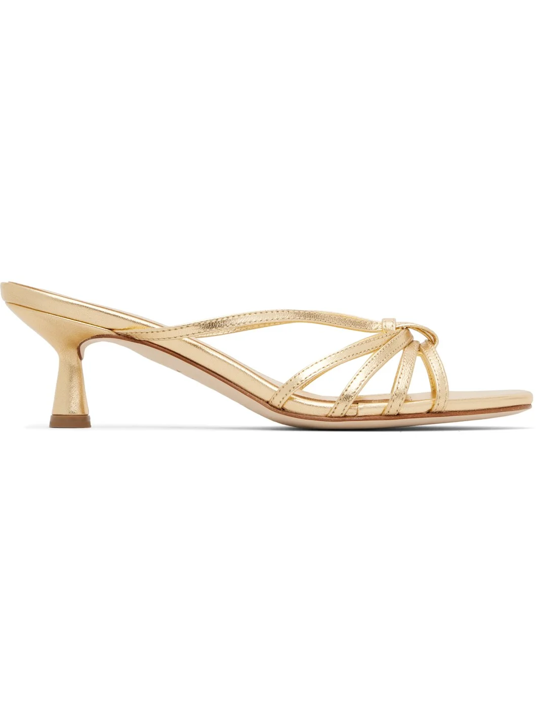 Laminated nappa leather heeled sandals. · Open toe · Straps with knotted detail at vamp · Logo embossed at lambskin footbed · Kitten heel with rubber injection · Nubuck sole · Heel: H2" Supplier color: Gold Laminated Nappa Leather. Made in Italy 261454F125034