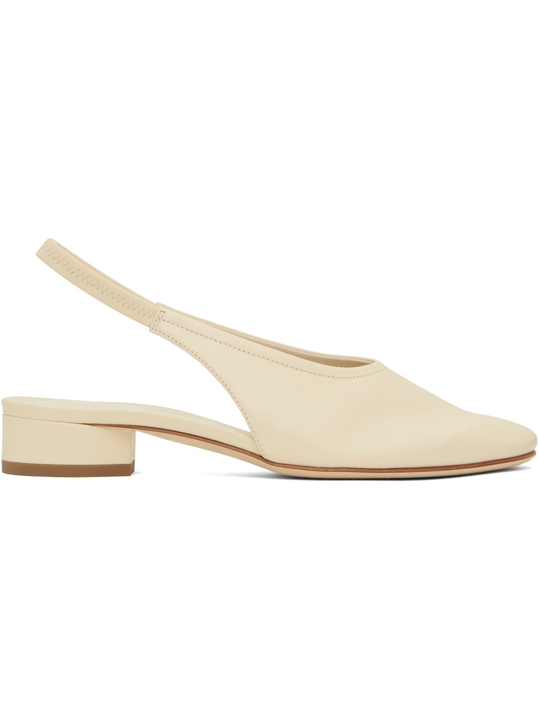 Buffed nappa leather heels in off-white. · Elasticized slingback strap · Logo embossed at padded leather footbed · Buffed leather lining · Covered block heel with rubber injection · Nubuck sole · Heel: H1" Supplier color: Creamy Upper: leather. Sole: leather, rubber. Made in Italy 251454F122060