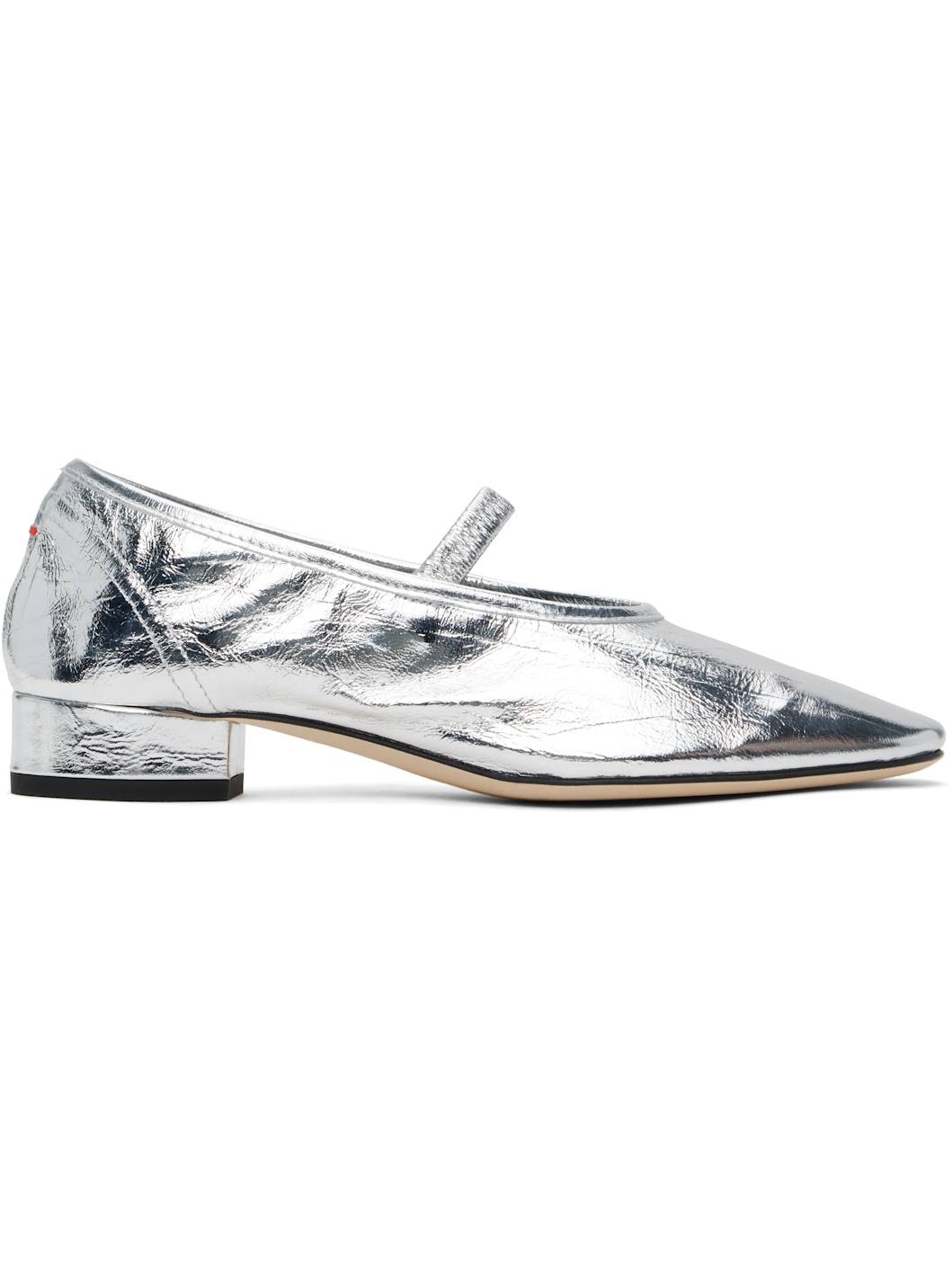 Crackled laminated calfskin ballerina flats in silver tone. · Square toe · Elasticized strap at vamp · Red stitch at heel collar · Grained leather lining · Covered block heel with rubber injection · Suede sole · Heel: H1" Supplier color: Silver Upper: calfskin. Sole: leather, rubber. Made in Italy 251454F118062