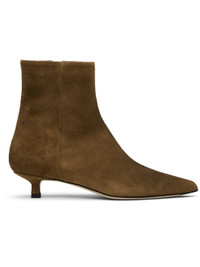 Ankle-high suede boots. · Pointed toe · Zip closure at inner side · Red stitch at heel collar · Buffed lambskin lining · Covered kitten heel · Leather sole with rubber injections · Heel: H1" Supplier color: Tobacco Upper: leather. Sole: leather, rubber. Made in Italy 252454F113020