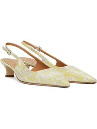 Snake-embossed goatskin heels in yellow, beige, and white. · Pointed toe · Pin-buckle slingback strap · Logo embossed at padded leather footbed · Buffed leather lining · Covered kitten heel with rubber injection · Nubuck sole with rubber injection · Heel: H1.5" Supplier color: Yellow Upper: goatskin. Sole: leather, rubber. Made in Italy 251454F122045