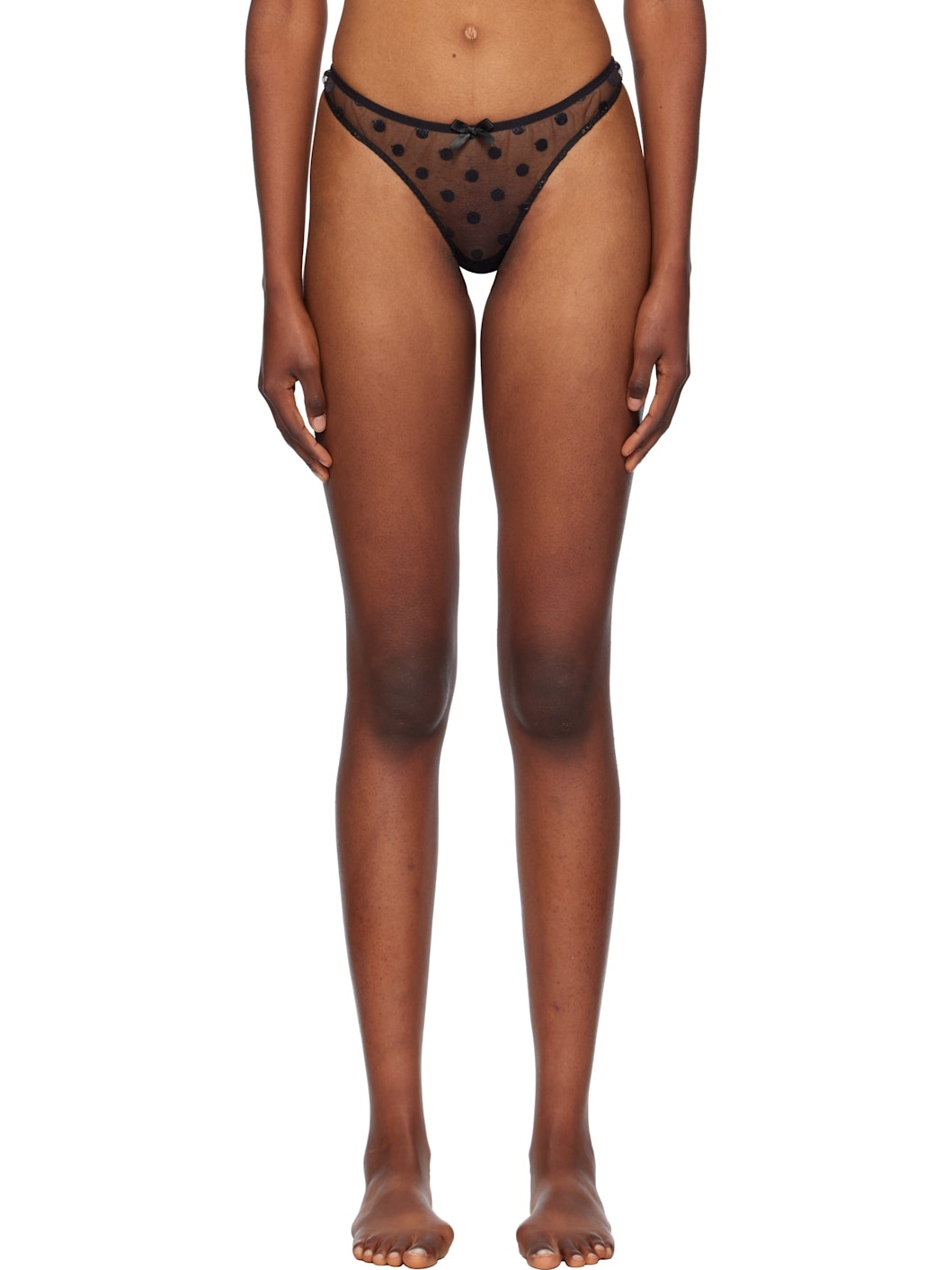 Sheer polyester tulle thong. Polka dot pattern embroidered throughout. · Bow applique at elasticized waistband · Partial cotton jersey lining Supplier color: Black Body: 100% polyester. Lining: 100% cotton. Made in Morocco 242281F081008