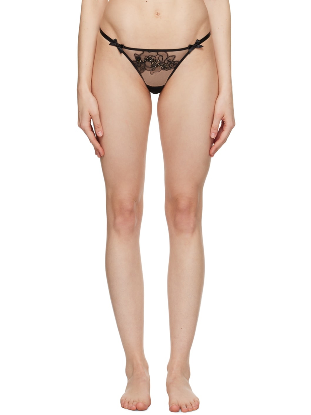 Semi-sheer nylon tulle thong. Embroidered floral pattern and hand-beaded detailing throughout. · Bow appliques at elasticized waistband · Partial cotton jersey lining Supplier color: Black/Black Body: 100% polyamide. Trim: 92% viscose, 8% polyamide. Lining: 100% cotton. Made in Morocco 241281F081004