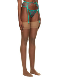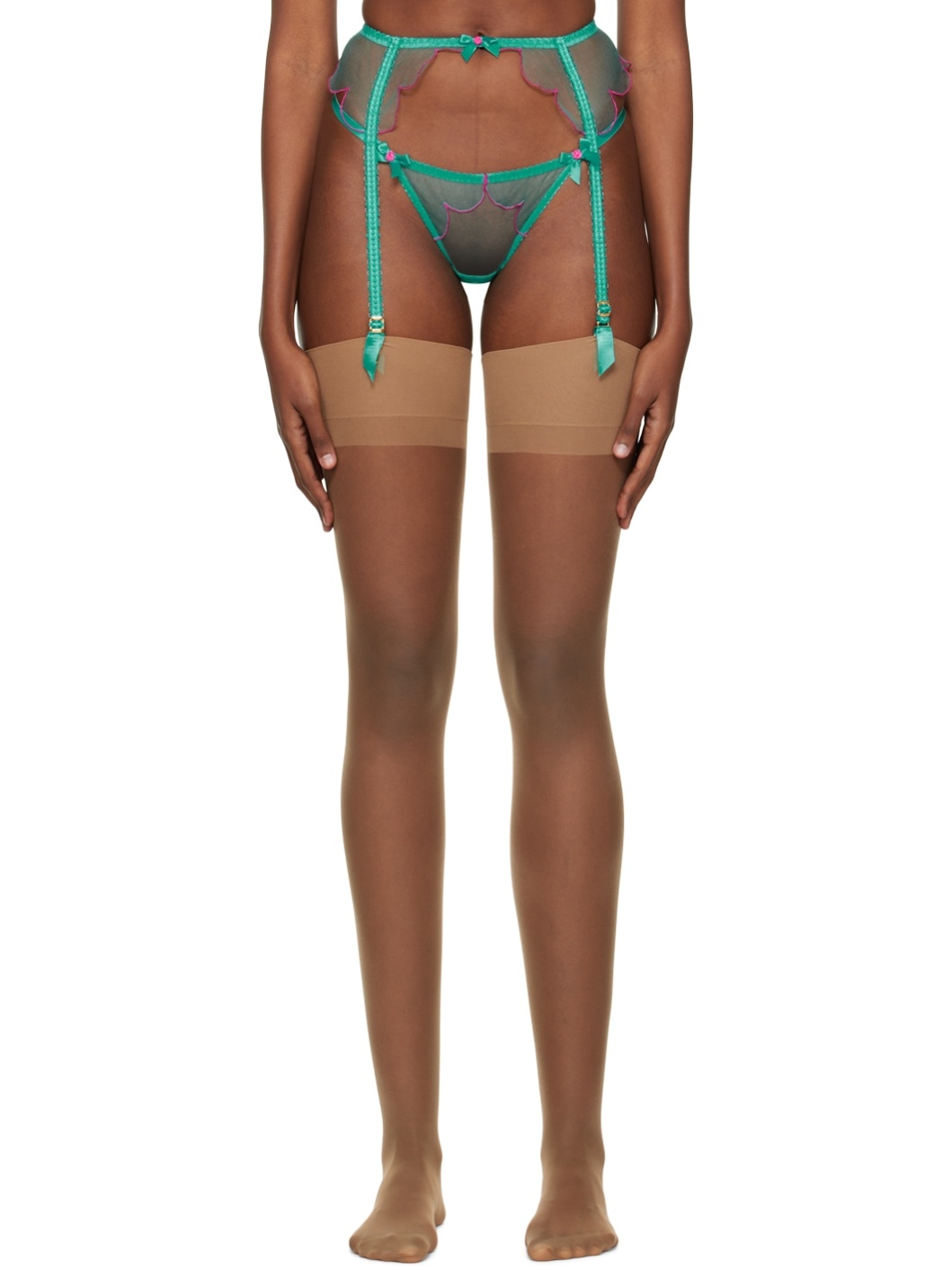 Semi-sheer nylon tulle garter belt. Scalloped edges and embroidered detailing throughout. · Bow detailing at elasticized waistband · Adjustable garter straps at hem · Adjustable hook-eye fastening at back waistband · Unlined · Gold-tone hardware Supplier color: Teal/Pink 100% polyamide. Made in Morocco 222281F368009