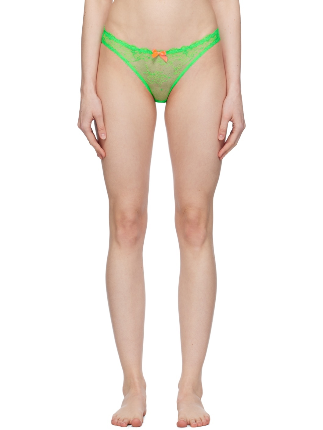 Sheer nylon lace briefs. · Elasticized scalloped edges throughout · Bow accent at front · Partially lined Supplier color: Green/Neon Body: 100% polyamide. Lining: 100% cotton. Made in Morocco 241281F074011